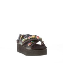 MARIA CRISTINA donna sandalo zeppa in pelle NERO con pietre. Zeppa 5 cm