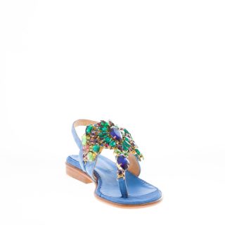 Sandalo infradito Tina realizzato in camoscio colore blu cobalto con maxi gioiello di pietre in vari colori. Chiusura con cinturino al tallone e fibbietta regolabile in metallo dorato. Suola in cuoio. Tacco di 2,5 cm
