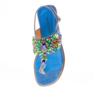 Blue cobalt suede thong sandal with a front maxi jewel made with multicolored rhinestones. Slingback strap closure with adjustable golden metal buckle. Leather sole. Heel 2,5 cm