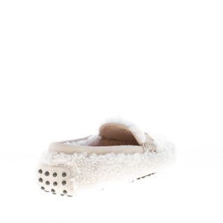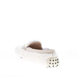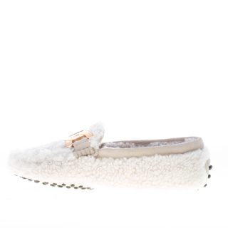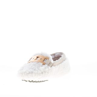 Gommini-Mokassin aus echtem weißem Shearling (Merinolamm) mit goldfarbener Metallkette mit Logo. Sichtbare Nähte in Relief. Ikonische Laufsohle mit charakteristischen Gummennoppen („Gommini“).