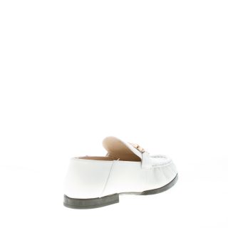Mokassin aus weichem weißem Leder mit leicht geraffter Spitze und umklappbarer Ferse für das Tragen im Sabot-Stil. Detail mit ikonischer goldfarbener Metallkette. Gummisohle mit charakteristischen Gummennoppen („Gommini“) in Relief. Absatzhöhe 1,5 cm.