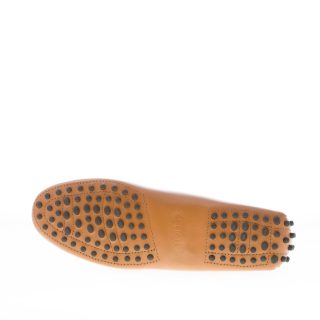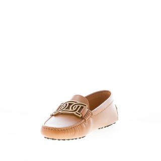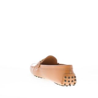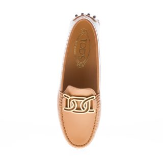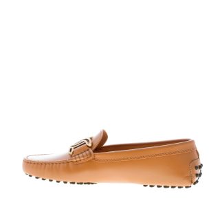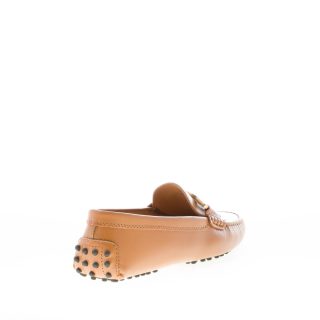 Mokassin Gommino Kate aus edlem cuoiofarbenem Leder mit ikonischem, durchbrochenem Kettenaccessoire aus antikgoldfarbenem Metall. Handgefertigte, sichtbare Ziernähte. Mokassin-Naht an der Spitze. Gommini-Noppensohle.