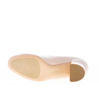 Decolletè Otilia 55 realizzato in morbida pelle rosa chiaro Petalo con silhouette a punta tonda  e l’iconico ornamento Gancini in metallo oro pallido. Suola in cuoio. Tacco largo di 5,5 cm