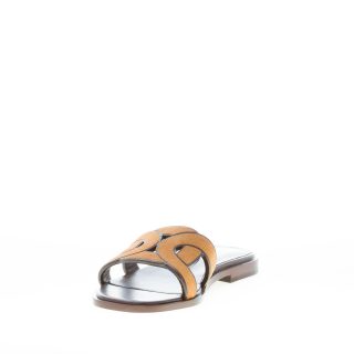 Flache Slide-Sandale aus edlem Veloursleder in Cuoio-Farbe mit breitem, geflochtenem Riemen, der das ikonische Kettenaccessoire interpretiert. Ledersohle. Absatz 1,5 cm.