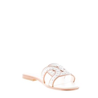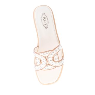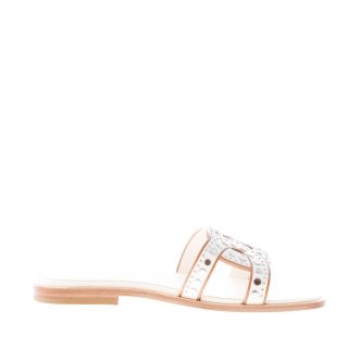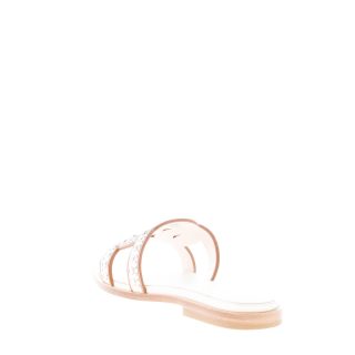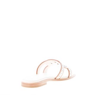 Flache Slide-Sandale aus edlem Ziegenleder in Creme (Mousse-Weiß) mit breitem, geflochtenem Riemen, der das ikonische Kettenaccessoire interpretiert. Der Riemen ist mit Metallnieten verziert. Ledersohle. Absatz 1,5 cm.