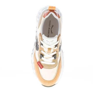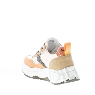 Sneaker Club105 realizzata in camoscio su tonalità di mostarda e marrone e tessuto nylon off-white con dettagli in pelle nera e oro. Allacciatura con occhielli hiking. Suola effetto plateau ultraleggera con maxi serigrafia brand