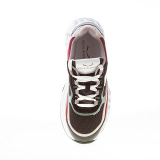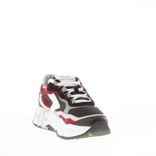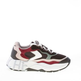 Sneaker Club107 realizzata in un mix di pelle e tessuto nylon nero con inserti in camoscio beige e bordeaux e pelle bianca. Suola a doppia altezza ultraleggera con serigrafia brand