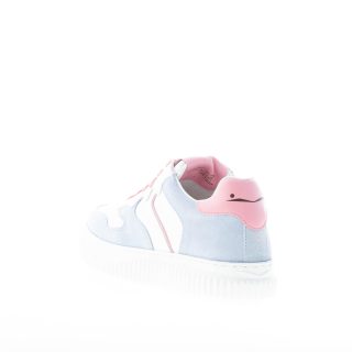 White leather Laura sneaker with blue sky suede inserts. Pink leather detail at back with logo. Internal removable footbed. Lightweight white rubber sole with knurled profiles