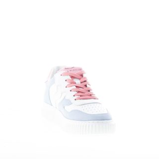 Sneaker Laura realizzata in pelle bianca con inserti in camoscio celeste. Talloncino logato in pelle rosa. Plantarino interno removibile. Suola a cassetta in gomma ultra leggera bianca con profilo zigrinato
