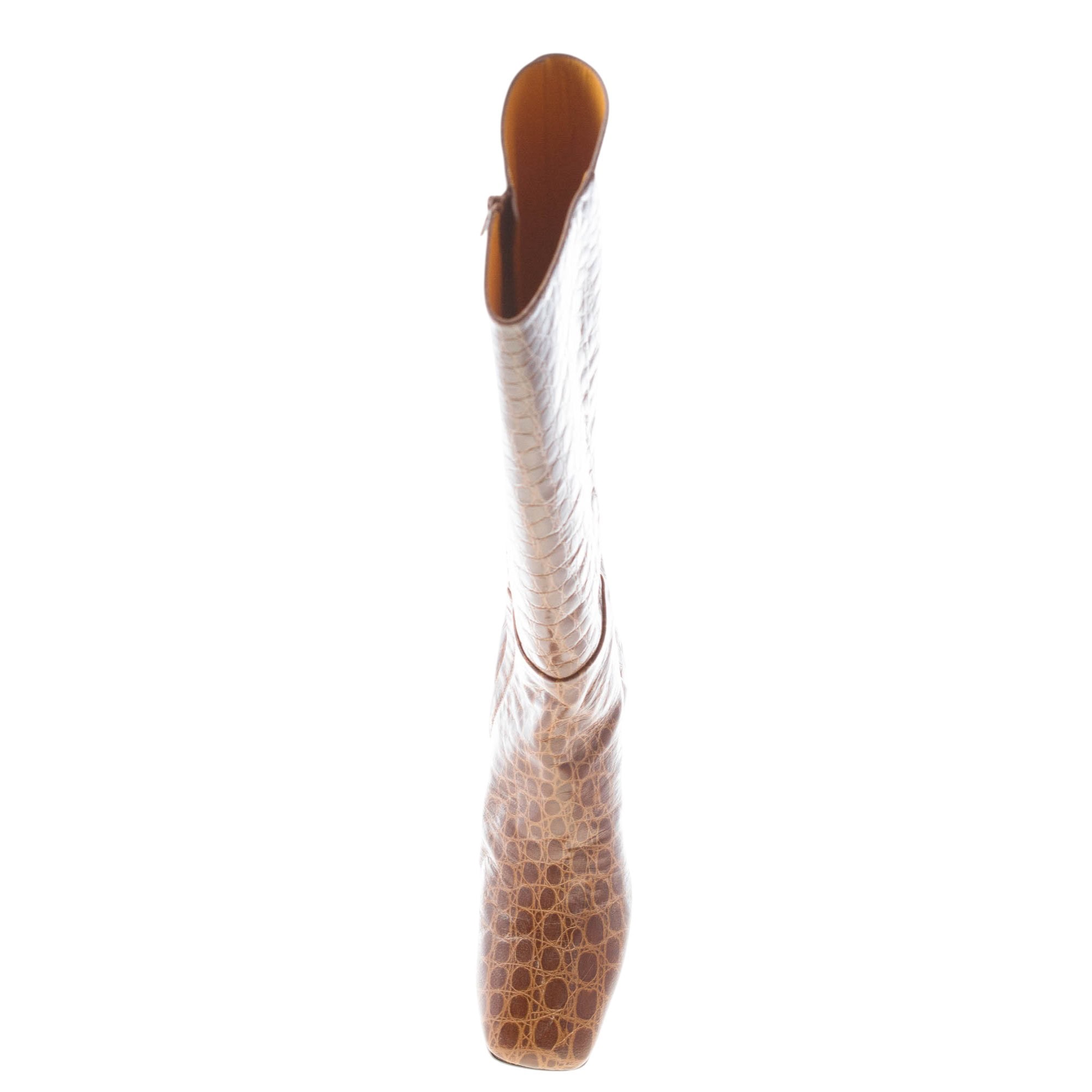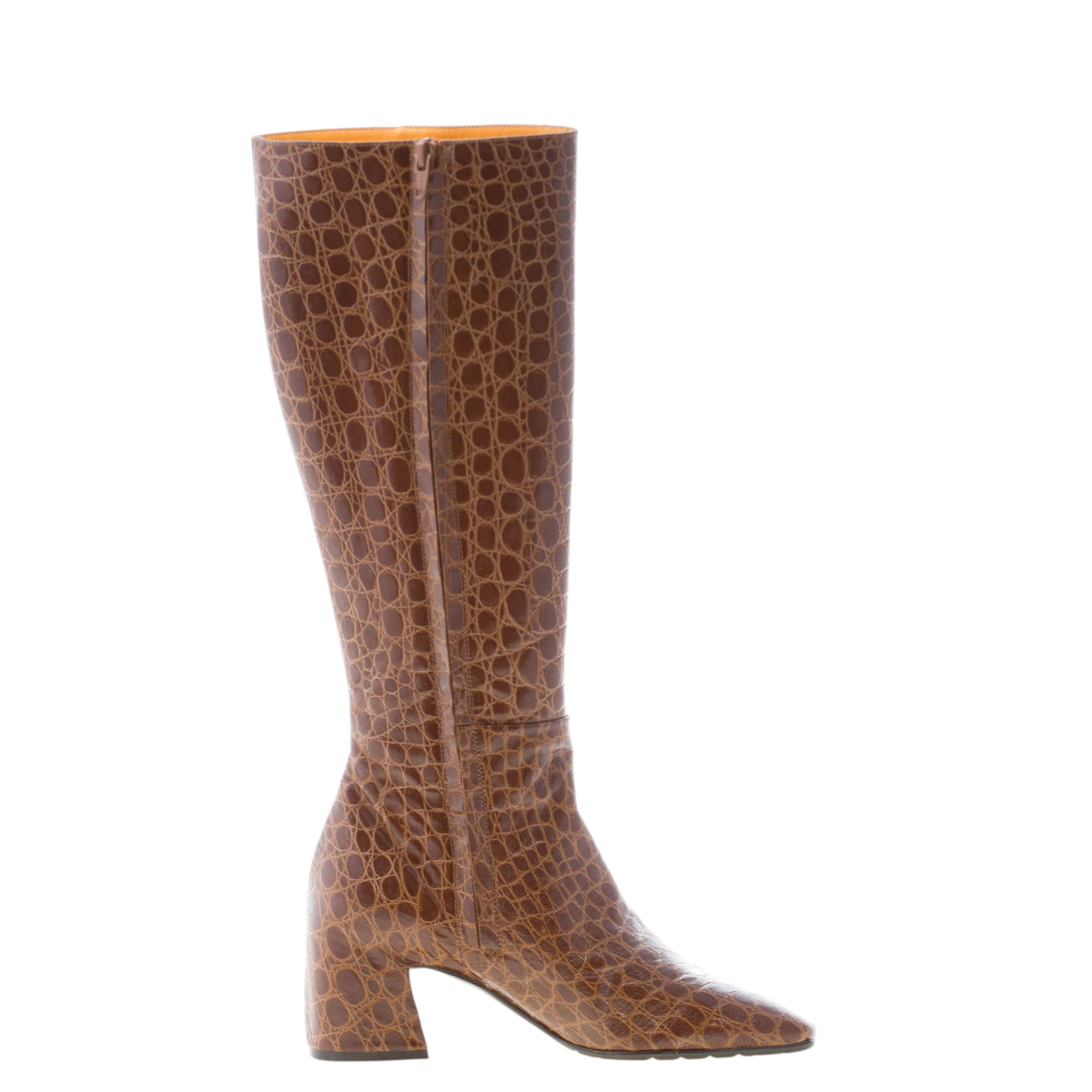 Brown soft croco-embossed leather boot with a slighlty squared toe and a zip fastening. Made in Italy. Ultra-flexible rubber sole. Heel 5,5 cm