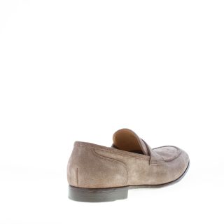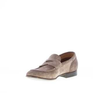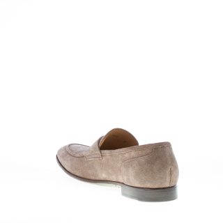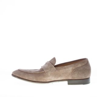 Loafer aus Veloursleder in Taupe mit der klassischen Penny-Spange. Mokassin-Naht auf der schmal zulaufenden Spitze. Ledersohle