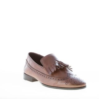 Natural taupe tone calf leather loafer with a slightly enlongated toe. Fringe and tassels detail at front. Embellishment with classical wingtip brogues decorations. Leather sole