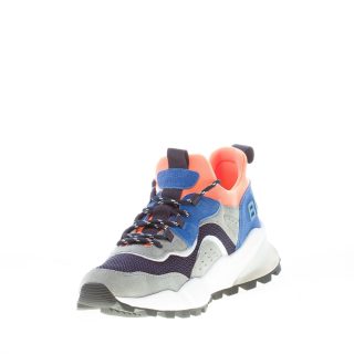 Sneaker Club04 realizzata in un mix di pannelli sovrapposti multicolore in camoscio e tessuto a rete. Tonalità di blu, grigio, azzurro e imbottitura alla caviglia in scuba arancione. Brand logo tridimensionale in gomma applicato al tallone. Suola rialzata in Eva e gomma