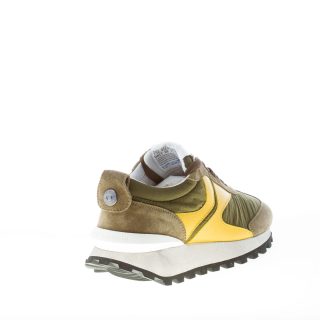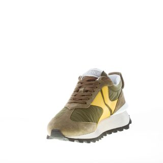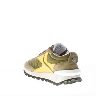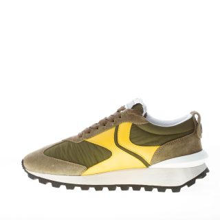 New QwarkSpur 2 sneakers featuring a mix of army green suede and nylon fabric with yellow leather monogram at sides and white rubber 3D heel stabiliser at back. Botton detail at the heel. Light-weight rubber sole with indented tread