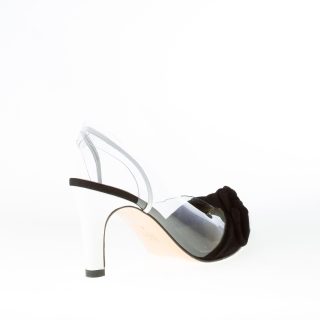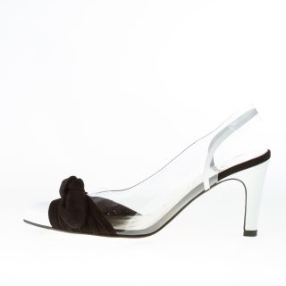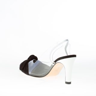 Transparent „crystal“ LIGUE slingback shoes with white patent leather and black suede bow detail. Leather sole. Heel 8,5 cm
