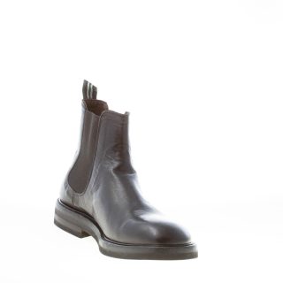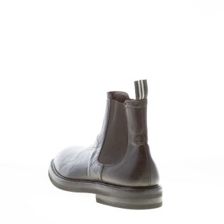 Elastischer Chelsea-Boot aus weichem gewaschenem schwarzem Leder mit glatter runder Spitze. Seitliche Elastikeinsätze. Zuglasche an der Ferse. Dainite-Gummisohle