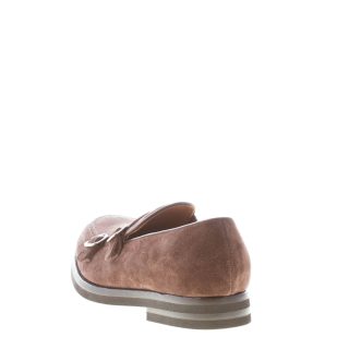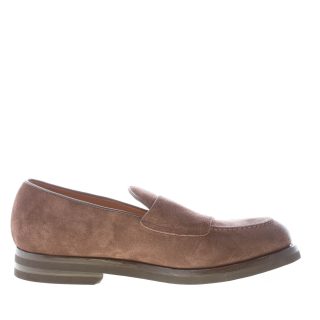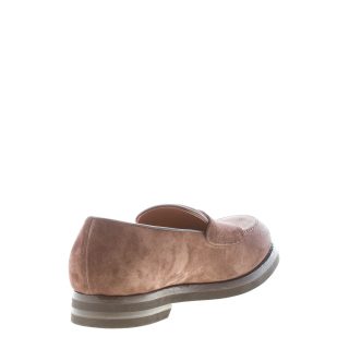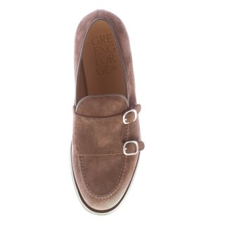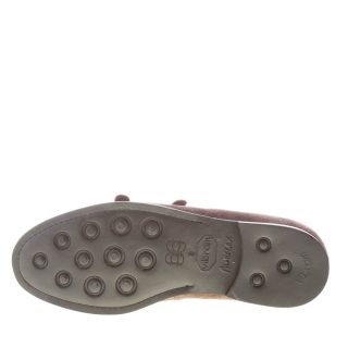 Handgefertigter Schuh aus gefettetem Veloursleder in Dunkelbraun mit doppelter Schnalle und runder Spitze mit erhabener Mokassin-Naht. Erhabene Nähte am äußeren Rahmen. Hergestellt in Italien. Gummisohle mit doppelter Zwischensohle aus Leder.