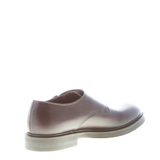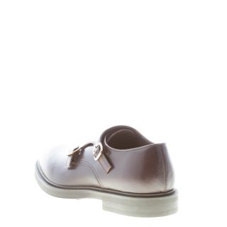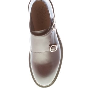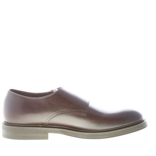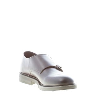 Handgefertigter Schuh aus Leder in Dunkelbraun mit doppelter Schnalle und glatter runder Spitze. Erhabene Nähte am äußeren Rahmen. Handgefertigt in Italien. Gummisohle