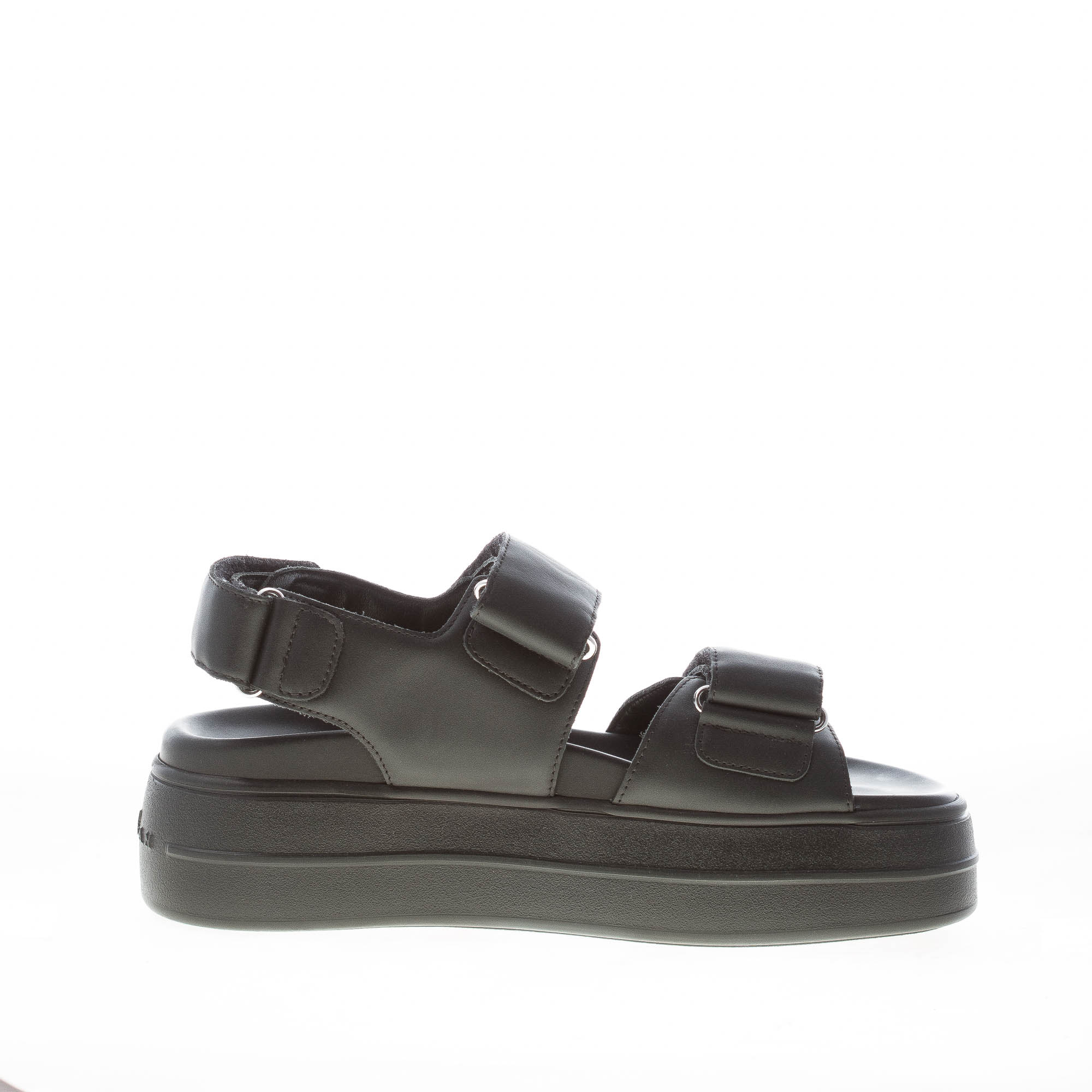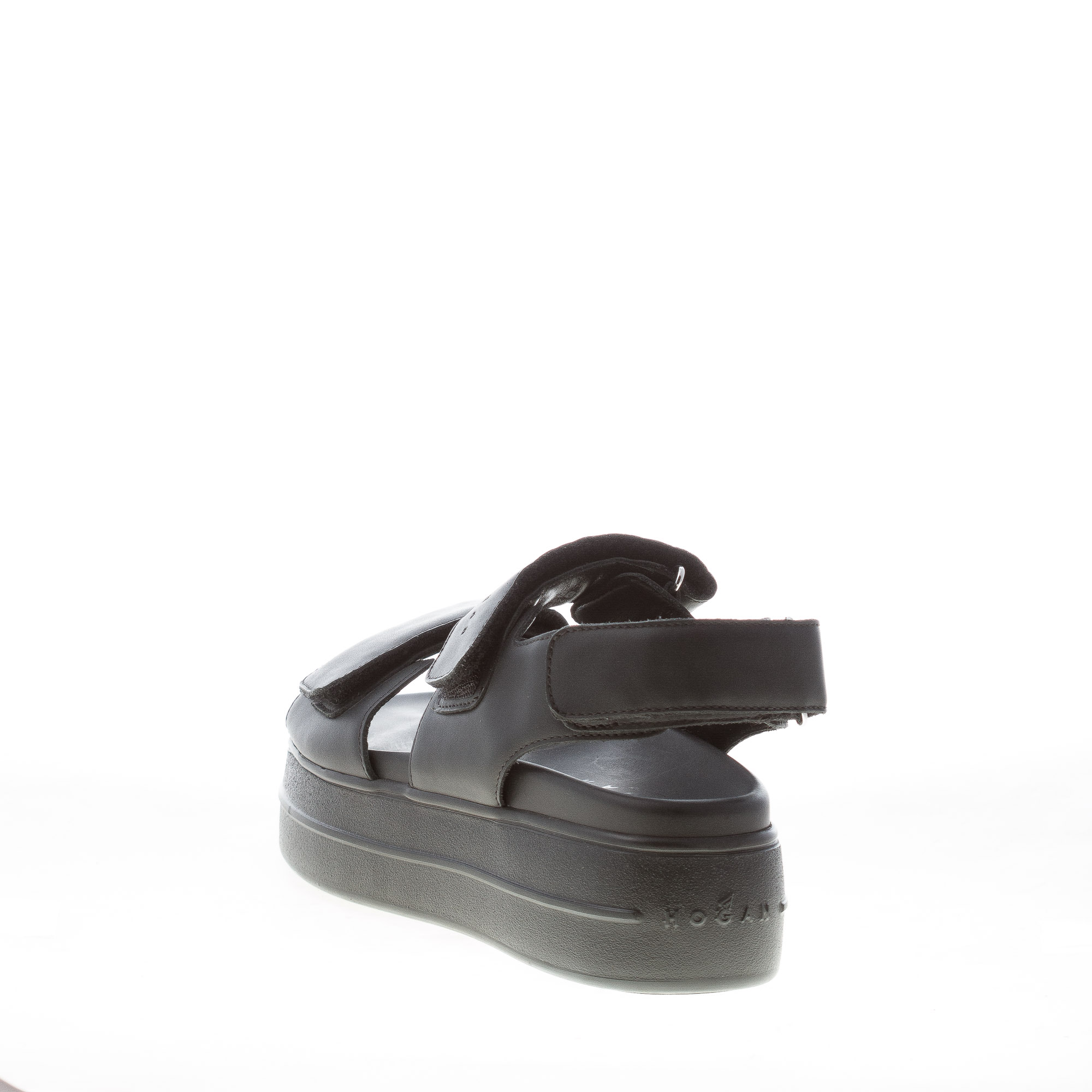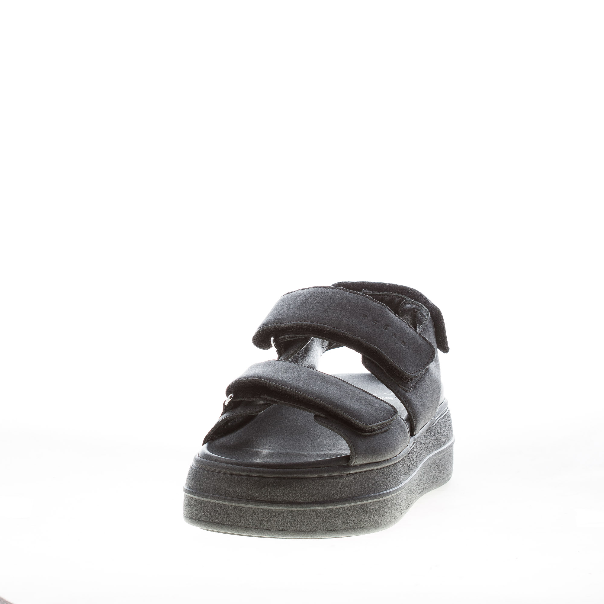 Sandale H680 aus weichem schwarzem Leder mit doppeltem Klettverschluss-Riemen über dem Spann. Fersenriemen mit Klettverschluss. Plateau-Gummisohle mit einer Absatzhöhe von 4,5 cm.