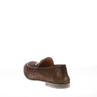 Dark brown fine suede Lipari elegant loafer with a classic refined golden metal horsebit and an apron toe stitching at toe. Italian artisanal craftsmanship. Blake construction. Leather sole