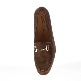 Mocassino Lipari realizzato in pregiato camoscio testa di moro con il classico morsetto in metallo dorato. Cucitura a vaschetta sulla punta. Lavorazione artigianale in Italia. Costruzione Blake. Suola in cuoio