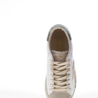 Sneaker Iconic 287, De Luxe Version Made in Italy, aus weißem Leder und grauem Veloursleder in Used-Optik. Seitliches Logo aus genarbtem Leder in Cremeton und Fersendetail mit grüner Reptilprägung. Herausnehmbare Innensohle. Gummisohle in Vintage-Optik mit einer Höhe von ca. 3,4 cm.
