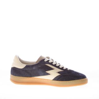 Sneaker Club 182, Made in Italy, aus gewaschenem Veloursleder in Navy mit seitlichem Logo und Fersendetail aus genarbtem Leder in Milchfarbe. Herausnehmbare Innensohle. Gummisohle in Honigfarbe mit einer Höhe von ca. 3,4 cm.