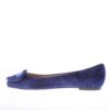 Ballerine in camoscio blu con fibbia patchwork in diverse tonalità di blu. Suola in cuoio.