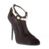 Mistico decolletè aperto in punta in camoscio nero con cinturino alla caviglia in pelle laminata oro. Suola in cuoio. Tacco 10,5 cm