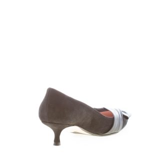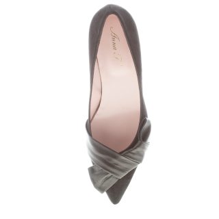 Black suede pointy toe pump with a decorative maxi crossed bow in black napa leather at the point. Kitty heel 4 cm. Leather sole with anti-slippering rubber insert
