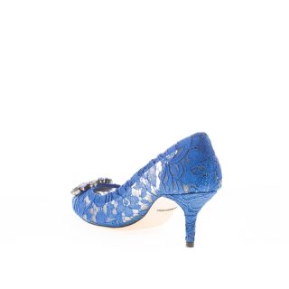 Decolletè Bellucci della collezione Rainbow realizzato in pizzo Taormina blu con l’iconica broche di cristalli colorati sulla punta. Suola in cuoio. Tacco stiletto di 6 cm