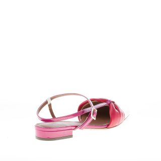 White and fuchsia patent leather slingback pump with a red napa leather decorative maxy bow. Slingback closure with ankle crossed strap and adjustable metal buckle. Leather sole. Covered heel 2,5 cm