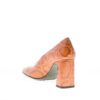 Décolleté in pelle stampa cocco marrone “mattone”. Impunture a vista. Tacco largo rivestito di 8 cm. Suola in gomma con gommini in rilievo
