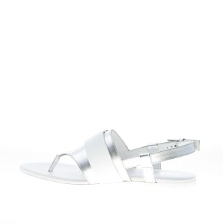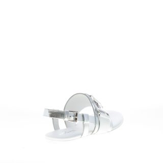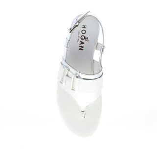 Sandalo infradito Valencia realizzato in pelle metallizzata argento con cinturino in pelle bianca ed accessorio brandizzato monogramma H in metallo argento. Chiusura con cinturino posteriore e fibbia regolabile in metallo argento. Suola piatta in gomma