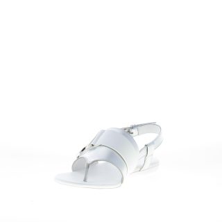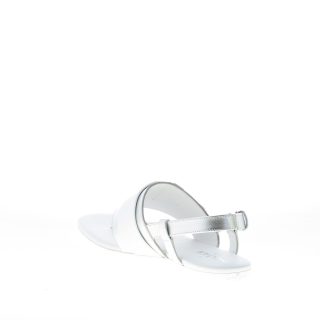 Silver leather Valencia flat thong sandal with front white leather strap and branded silver metal H monogram. Slingback strap closure with silver metal adjustable buckle. Flat rubber sole
