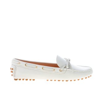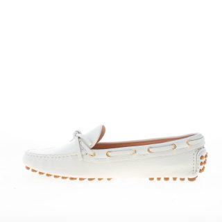 “Talco” white tie front driving mocassin. Exposed stitching and tubolar construction. Gold-tone metal eyelets. Rubber studded sole