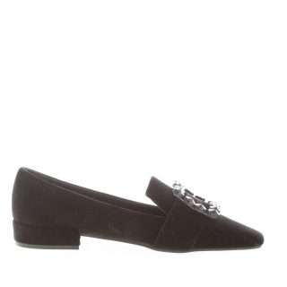 Mocassino Felisa realizzato in velluto nero con maxi fibbia decorativa di pietre nere sulla punta sfilata. Tacco in velluto di 2 cm. Suola in gomma