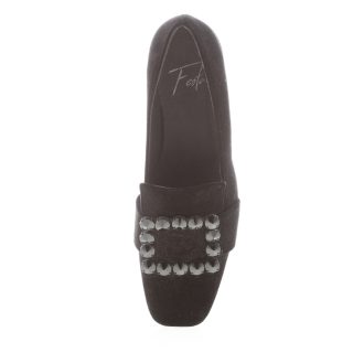Black velvet squared toe Felisa loafer with a front maxi buckle detail made with black stones. Velvet covered heel 2 cm. Rubber sole