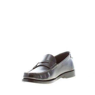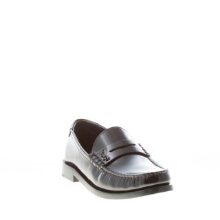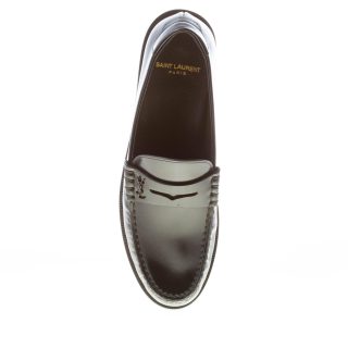 Black smooth semi-shiny leather penny loafer with decorative chrome-black metal YSL monogram. Leather sole