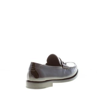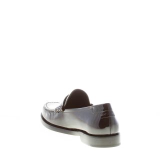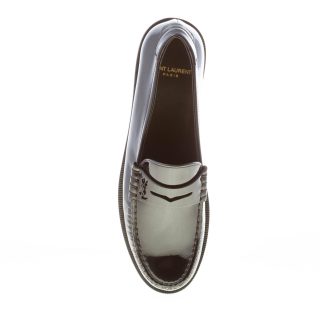 Mocassino in pelle verniciata nera con la classica mascherina penny e logo decorativo YSL in metallo cromato nero. Suola in cuoio