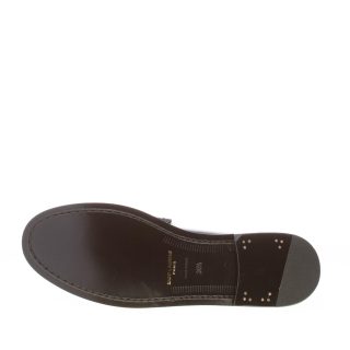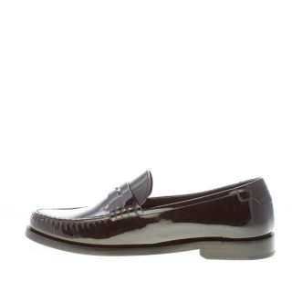 Black patent leather penny loafer with decorative Cassandra chrome-black metal YSL monogram. Leather sole