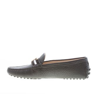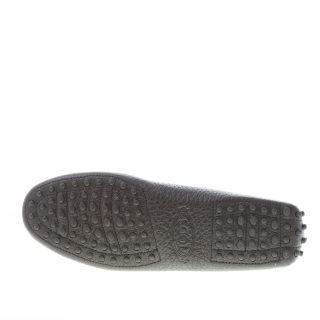 Black hammered leather “gommino” driving shoes with penny bar, silk-screened gros grain insert and Tod’s double-T metal monogram. Exposed hand stitching. Iconic rubber pebbles outsole