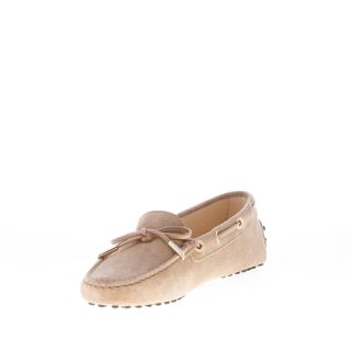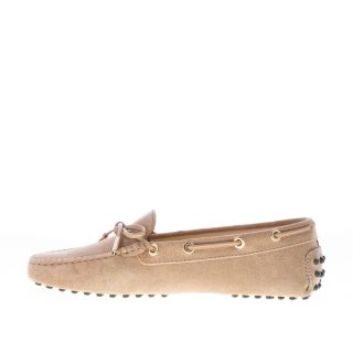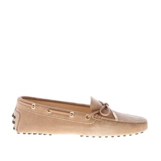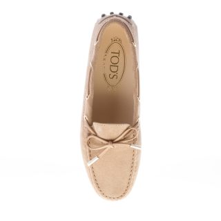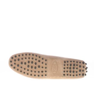 Iconico mocassino in pregiata pelle scamosciata beige con laccetto passante in pelle e fermalacci personalizzati in metallo dorato. Impunture a vista realizzate a mano. Monogramma Tod’s impresso. Iconica suola con gommini