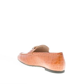 Mocassino Timeless in pelle stampa coccodrillo marrone (mattone) con mascherina ed accessorio monogramma Tod’s in metallo con logo. Cuciture a vista. Suola in gomma con gommini in rilievo