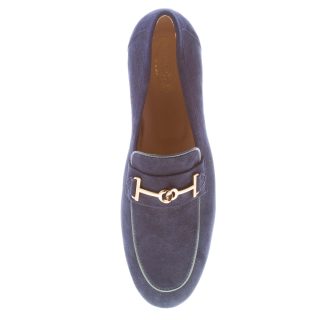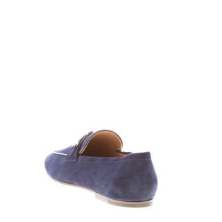 Galaxy blue fine and elegant goat suede leather flat loafer with the metal T-Ring horsebit accessory. Exposed stitchings. Apron toe front detail. Leather sole