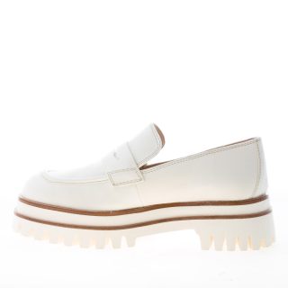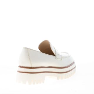 Pale beige soft leather Due Vea platform loafer with a front penny bar and apron toe stitching at the slightly squared toe. Heel height 5 cm with a 3,5 cm platform and a contrasting thick leather finishing. Rubber sole with lug detailing