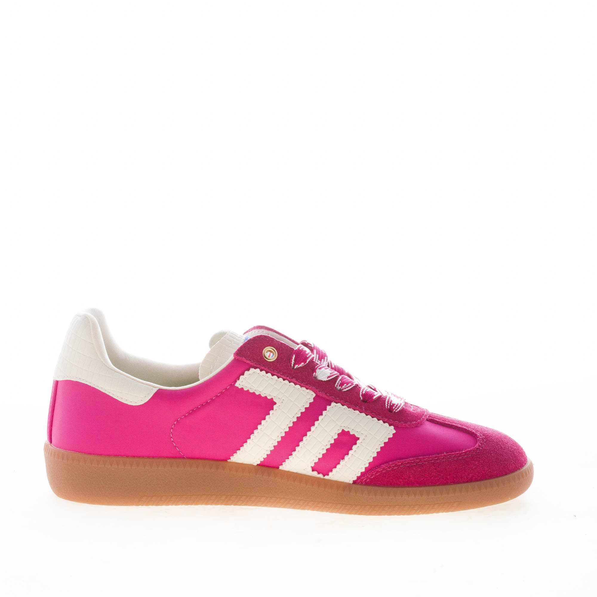 Ghost 11 sneaker made in cherry color fabric and suede with milk tone croco printed leather logo 70 at side and back detail. Removable footbed of 1,5 cm. Rubber sole with a 2,5 height at the heel