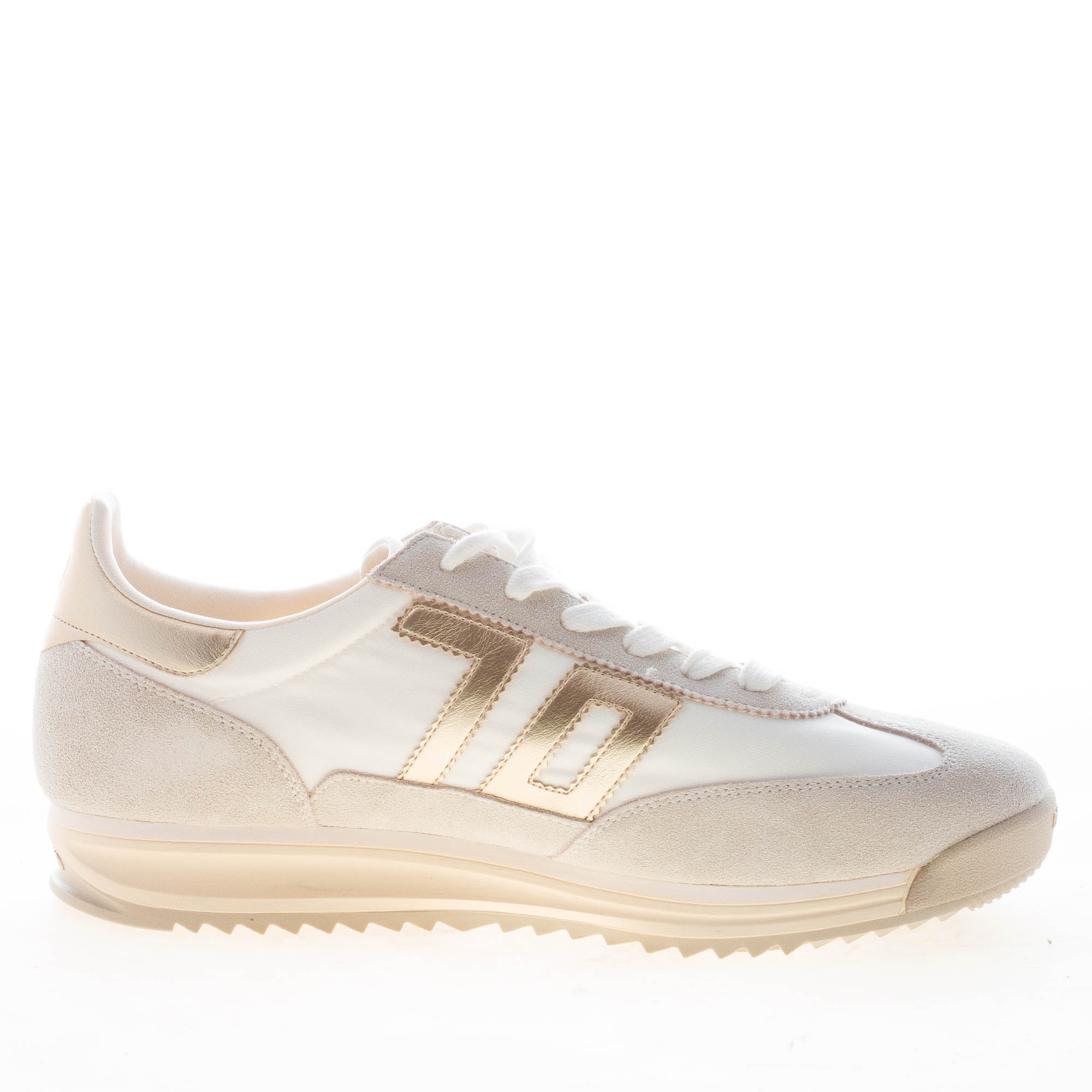 Barkley Jogger 32 sneaker made in white nylon fabric with grey suede panels. Gold croco printed metallic leather logo 70 at side and back detail. Tonal laces and removable 1,5 cm footbed. Rubber