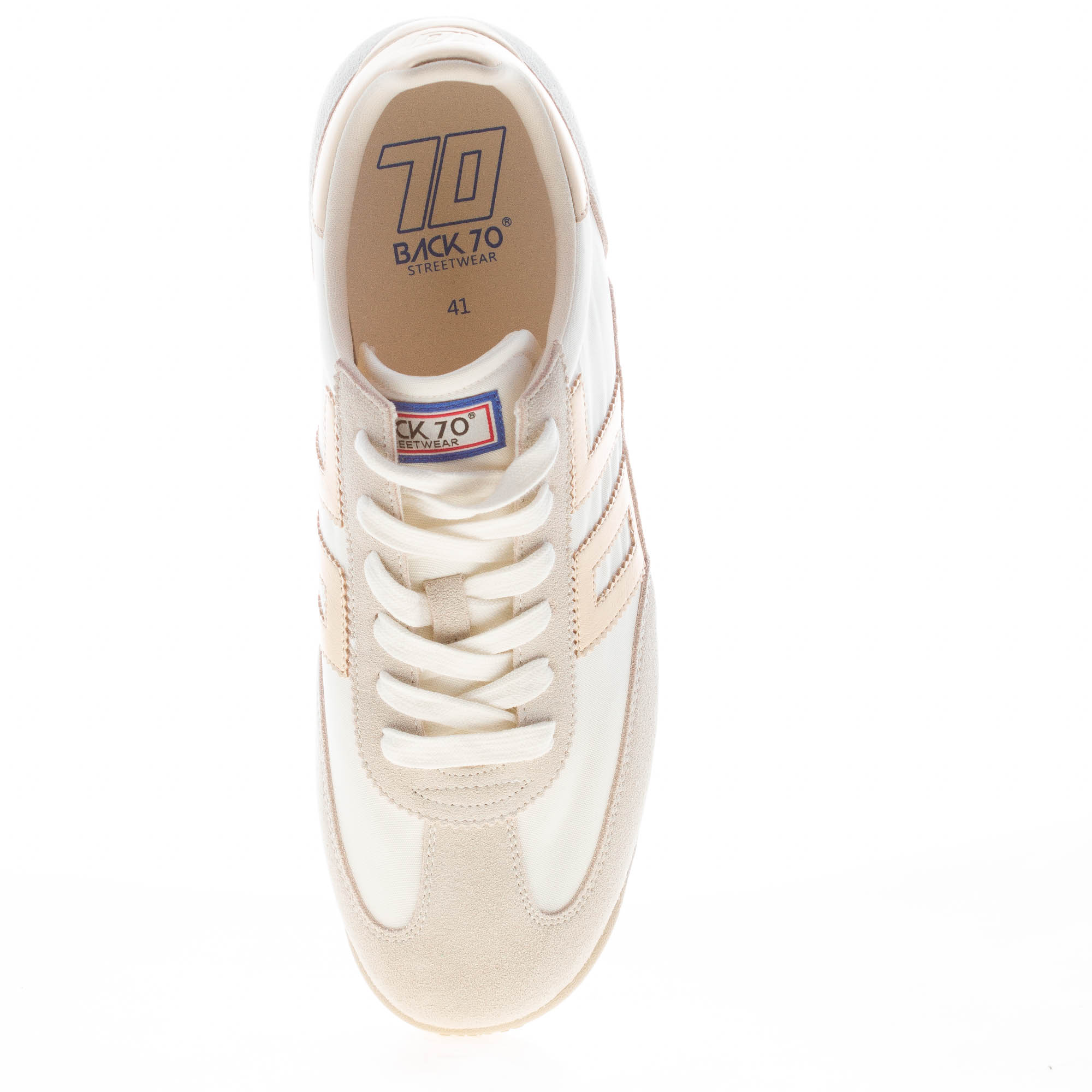 Sneaker Barkley Jogger 32 realizzata in tessuto nylon bianco e camoscio grigio. Logo 70 ai lati e talloncino in pelle stampa cocco metallizzata oro. Allacciatura monocolore e plantarino estraibile di circa 1,5 cm. Suola in gomma con altezza di circa di circa 3,5 cm