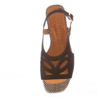 Tanzo sandal made with black suede crossed straps at toe and a slingback closure with a strap and an adjustable metal buckle. Leather sole with rubber antislippering insert. Printed covered heel 2 cm